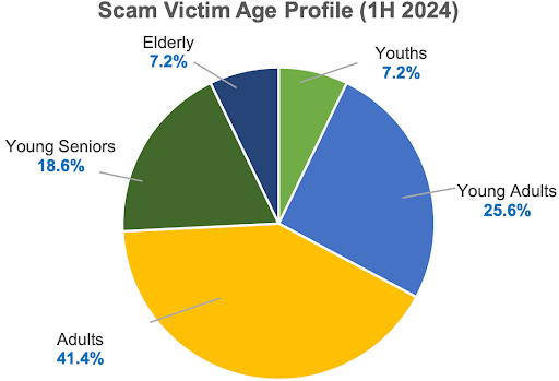 Depression and/or social isolation are also alarming causes of victims falling for scams. Many victims (especially the elderly) live alone and lack support from family members, some even do not have any. Therefore, they feel supported when even the slightest attention is given to them. Scammers exploit this by impersonating friends or people willing to befriend them, deceiving and manipulating how they think, causing them to give more and more money. This is exacerbated by fear and urgency techniques – making it seem urgent for the elderly to pay more to get the supposed promised returns. Elderly, aged 65 and above made up 7.2% of scam victims. Most fell prey to ‘fake friend call’ scams, followed by investment scams. Though the elderly make up one of the smallest age groups of scam victims, as shown in the chart below, the average amount lost per elderly victim is still the highest when compared to victims of the other age groups. This is alarming, as entire life savings are lost without the ability to recover financially. In fact, many worried children approached my Neighbourhood Police Centre (NPC)’s counter with their elderly parents to report that their parents fell for scams and lost up to 30k at once. Scammers exploit victims’ emotions so cunningly that people often find themselves deceived before they even realise what’s happening.